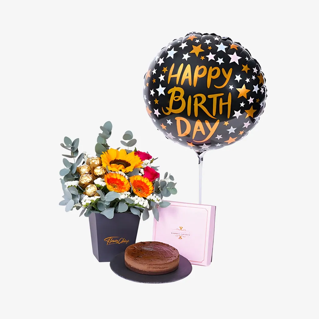 Celebrate someone’s special day in the most vibrant way with the “Happy Birthday” gift set from Secret Flowers. This eye-catching arrangement includes bright Gerberas, golden sunflowers, cerise pink roses, a decadent birthday cake, and a customizable black helium balloon with a personal message.
